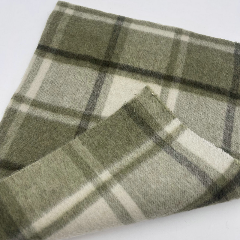 Dette stof, betegnet som artiklen ZZH25001, er et tykt vævet tekstil bestående af 30% uld og 70% andre fibre. Med en masse pr. arealenhed på 900 g/m udviser materialet betydelig tæthed og vægt. Overfladen har et grønt plaidmønster med en skyggeeffekt skabt gennem specialiserede væveteknikker. Denne konstruktionsmetode giver lagvis visuel dybde i gitterformationen. Inkluderingen af uldfibre i blandingen påvirker stoffets termiske reguleringsegenskaber. Disse tekniske specifikationer resulterer i et kraftigt vævet stof, der er velegnet til struktureret beklædningsgenstand, hvor der kræves en udtalt tekstur og betydelig tilstedeværelse.