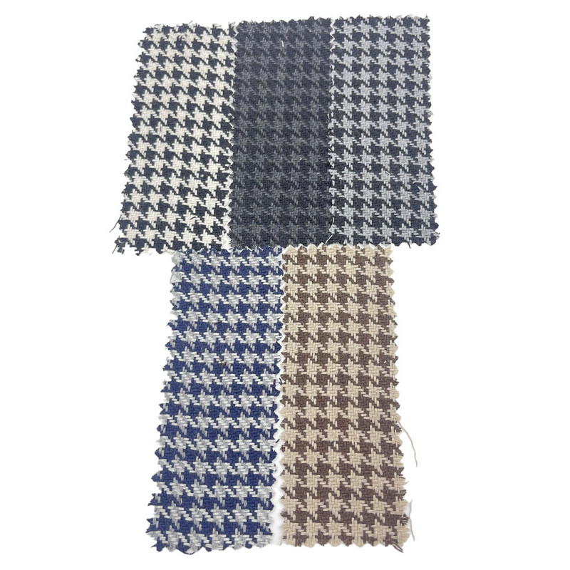 Dette stof, betegnet som artikel 3946, er et vævet tekstil bestående af 10% uld og 90% andre fibre. Med en masse pr. arealenhed på 450 g/m præsenterer den en mellemvægtig konstruktion. Den mørkegrå overflade har et houndstooth-mønster, skabt gennem en specifik væveteknik, der producerer knækkede tern eller firtakkede former. Dette klassiske geometriske motiv er kendetegnet ved dets gentagende kontrasterende tonale effekt. Uldblandingssammensætningen bidrager til stoffets termiske regulering og spændstighed. Disse tekniske egenskaber resulterer i et materiale med defineret mønsterartikulation og strukturel holdbarhed, hvilket gør det anvendeligt til hættetrøjer, hvor visuel mønsterdefinition og langsigtet ydeevne er påkrævet.