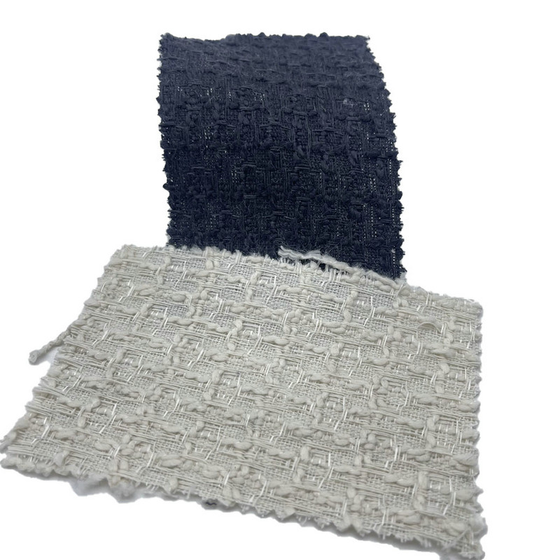 Dette stof, betegnet som artikel 3786, er et tweed-tekstil bestående af 10% uld og 90% andre fibre. Med en masse pr. arealenhed på 500 g/m præsenterer den en mellem- til tung konstruktion. Overfladen har et sort-hvidt ternet mønster forstærket af en prægningsproces. Denne teknik skaber en forhøjet tekstur på specifikke områder af gitteret, hvilket tilføjer en tredimensionel effekt til det geometriske design. Uldblandingssammensætningen bidrager til stoffets termiske regulering og formfastholdelse. Disse fremstillingsteknikker resulterer i et materiale med forbedret visuel dybde og strukturel integritet, hvilket gør det anvendeligt til frakker, hvor overfladetekstur og mønsterdefinition er påkrævet.