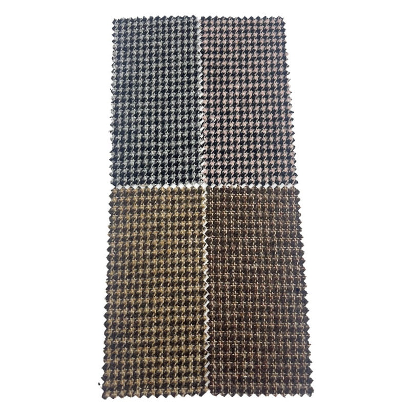 Dette stof, betegnet som artikel 4334, er et vævet tweedtekstil, der består af 35% uld og 65% andre fibre. Med en masse pr. arealenhed på 450 g/m præsenterer den en mellemvægtig konstruktion. Overfladen kombinerer et houndstooth-mønster med ternelementer, hvilket skaber et sammensat geometrisk design gennem præcise væveteknikker. Denne konstruktionsmetode producerer sammenlåsende brækkede tern med defineret farvekontrast på tværs af stoffet. Uldblandingssammensætningen bidrager til stoffets formstabilitet og rynkebestandighed. Disse tekniske egenskaber resulterer i et materiale med indviklet mønsterartikulation og strukturel holdbarhed, hvilket gør det anvendeligt til bukser, hvor detaljeret mønster og langsigtet ydeevne er påkrævet.